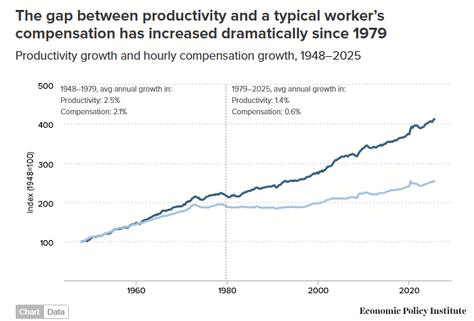 Worker productivity has never been higher, and worker compensation has...stagnated, effectively, growing a modest ~57% in compensation since 2000, while productivity has skyrocketed ~139%. If it feels difficult making ends meet in 2026 on even a six-figure job, it's because you should honestly be making twice as much money. No wonder workers were pissed over RTO: clawing back the hour of unpaid commuting time every day was the equivalent of a 12.5% raise in terms of saved time alone, nevermind the savings on lunches, vehicle wear-and-tear, fuel, and insurance.